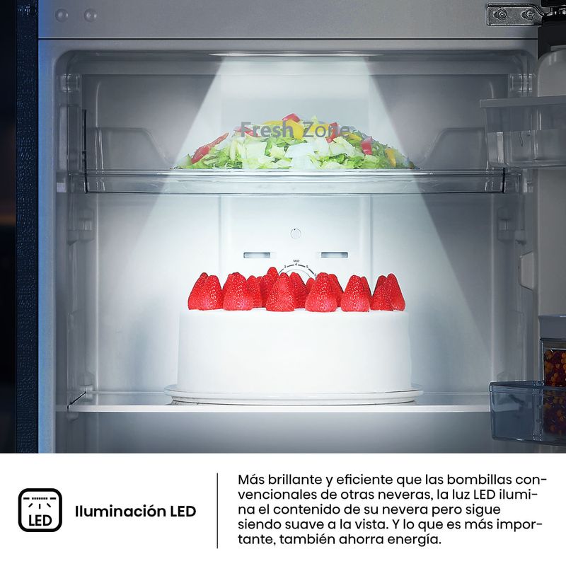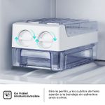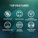 Dispensador de agua y twist ice maker permiten servir bebidas y obtener hielo en cualquier momento, sin abrir la puerta; la luz LED interior ilumina cada estante para ver claramente el contenido incluso de noche. El cajón grande para verduras y las bandejas ajustables simplifican la organización, mientras el filtro desodorizante mantiene el ambiente interior fresco. El refrigerante ECO de R600a/32 g refuerza la eficiencia sin sacrificar rendimiento.