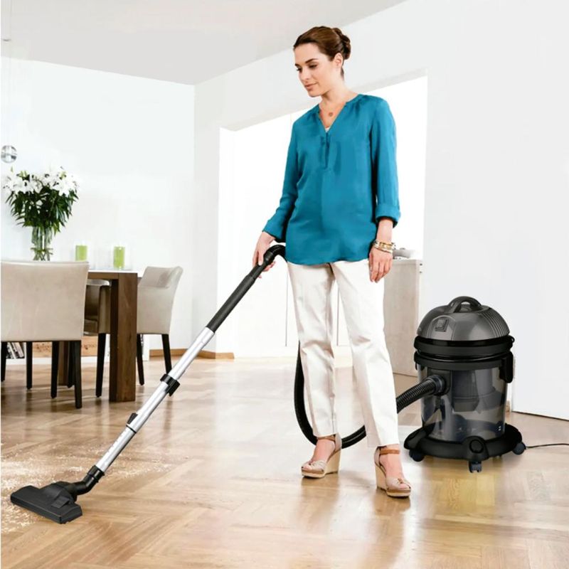 La Aspiradora Con Filtro De Agua Mastermaid HVC3001 es una solución para limpiar sólidos y líquidos, con 1200 W de potencia y un tanque de 5 L. Su peso de 6.8 kg y el cordón de 110 V facilitan maniobras en cualquier rincón, todo en un acabado negro sobrio.