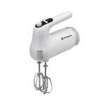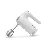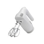 El conjunto incluye batidores de acero inoxidable, con la función de extracción rápida mediante botón eyector para cambiar accesorios sin ensuciarse. La función de almacenamiento de cable mantiene la encimera ordenada y evita enredos. El talón de descanso permite apoyar la batidora entre pausas, y las dimensiones (Alto 14 cm, Ancho 10 cm, Profundidad 19 cm) junto con un peso de 1.2 kg destacan su perfil compacto. El cuerpo, de plástico resistente, luce un acabado blanco que combina con cocinas modernas.