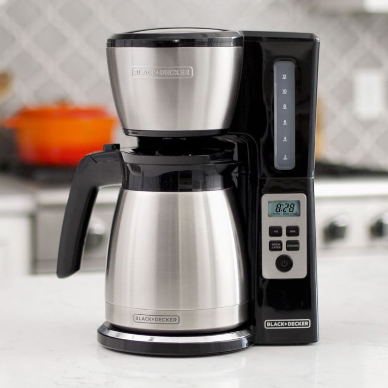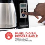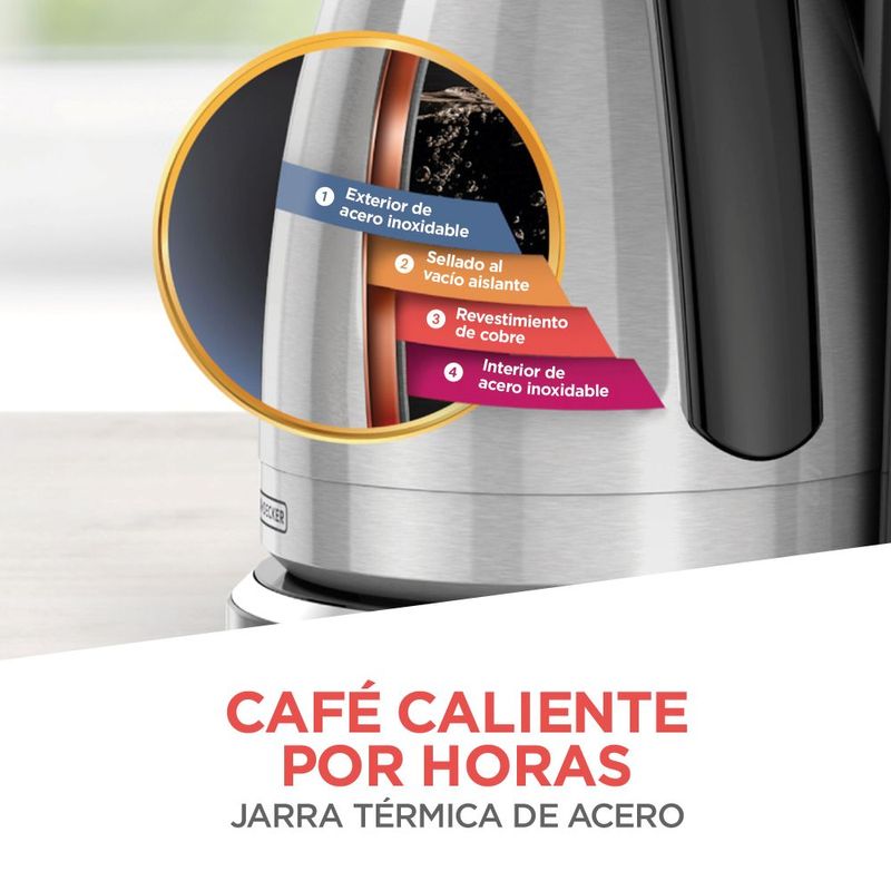 Cafetera Black and Decker Automática CM2046S-LA. Tiene Jarra de Acero Inoxidable con capacidad de 12 tazas elaborada con 4 capas para mantener tu café caliente por más tiempo. También tiene controles digitales para programar fácilmente la hora en la que quieres preparar tu café automáticamente. La Cafetera Black and Decker cuenta con sistema de goteo Vortex. Filtrado optimizado y eficiente en forma de vórtice, abarcando más café para lograr un sabor más intenso y fresco. La Cafetera Black and Decker tiene dispositivo de Interrupción de Colado que permite que puedas disfrutar una deliciosa taza de café sin tener que esperar que te termine el ciclo de colado. La Cafetera Black and Decker cuenta con la función de mantener caliente por más tiempo y usa filtros de papel de canastilla.