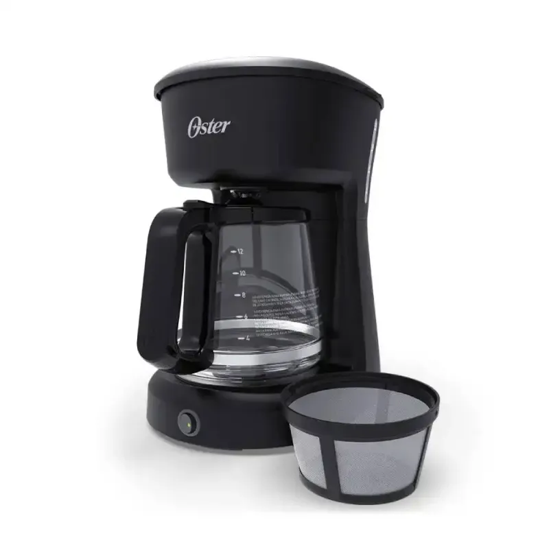 La Cafetera Eléctrica Oster BVSTDCS12B-013, en negro, ofrece capacidad para 12 tazas con filtro permanente y pausa para servir. Jarra de vidrio y cuerpo en acero inoxidable aportan durabilidad y una estética sobria para la cocina diaria. La operación es clara y el aroma del café se despliega de forma constante.