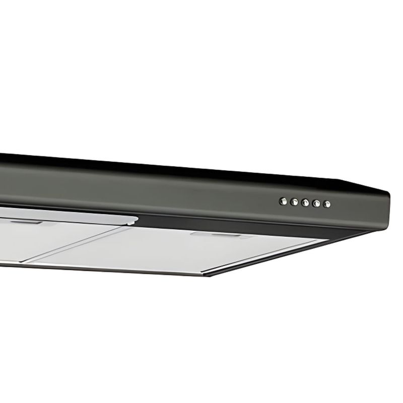 Control frontal ajusta la extracción sin interrumpir la cocción, mientras 2 LEDs de 25 W iluminan con claridad la zona de trabajo. Filtros metálicos triples retienen grasa y vapores, simplificando la limpieza, y el cuerpo de acero inoxidable con acabado negro mate combina con cocinas modernas. Opera a 110 V y ofrece una extracción de 210 m3/h para mantener el aire limpio.
