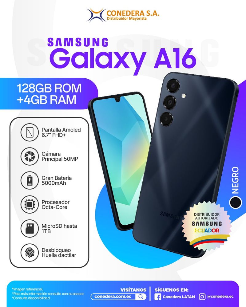 Pantalla Tamaño: 6.7 pulgadas Tasa de Refresco: 90 Hz Plataforma Android 14 Procesador: Exynos 1330 octa-core 2.4GHz GPU: ARM Mali-G57 MC2 MEMORIA RAM: 4GB Almacenamiento: 128 GB Principal: Triple, 50 MP (f/1.8, AF, wide) + 5 MP (f/2.2, ultrawide) + 2 MP (f/2.4, macro) Frontal: 13 MP, f/2.0 Batería Capacidad: 5000 mAh Tipo: Li-Po Extraíble: No Carga: Si, 25W Carga inalámbrica: No Carga reversible: No Garantía: 12 meses