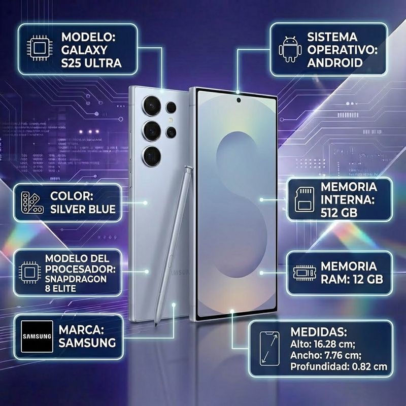 Con una pantalla AMOLED de 6.8 pulgadas, resolución 1440 x 3120 y una tasa de refresco de 120 Hz, Galaxy S25 Ultra ofrece imágenes nítidas y movimientos fluidos para cualquier tarea. Sus bordes curvos y el acabado Silver Blue destacan en el uso diario. Su diseño cómodo facilita el manejo con una sola mano.