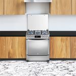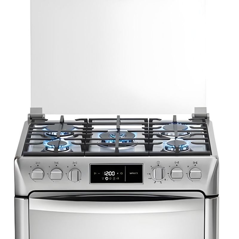 Línea Quarzo-R, disponible en Acero Inoxidable, tapa de vidrio templado recta, nuevas bisagras, tablero en Acero Inoxidable, parrillas fundidas, quemador ultra rápido triple corona, zona de Control, encendido directo desde perillas en horno y quemadores, panel de control con pulsantes switch doble control, sistema corta gas con apagado automático en horno