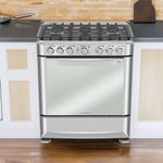 Potencia y precisión se combinan en esta cocina a gas freestanding de 76 cm de ancho, diseñada para platos que exigen un calor estable y distribución uniforme. Con 6 quemadores y encendido eléctrico, controla el fuego con comodidad desde la perilla, y dorado extra gracias al grill superior a gas. El acabado en acero inoxidable mantiene la cocina elegante y resistente a las manchas, mientras la luz interior acompaña cada etapa de horneado.