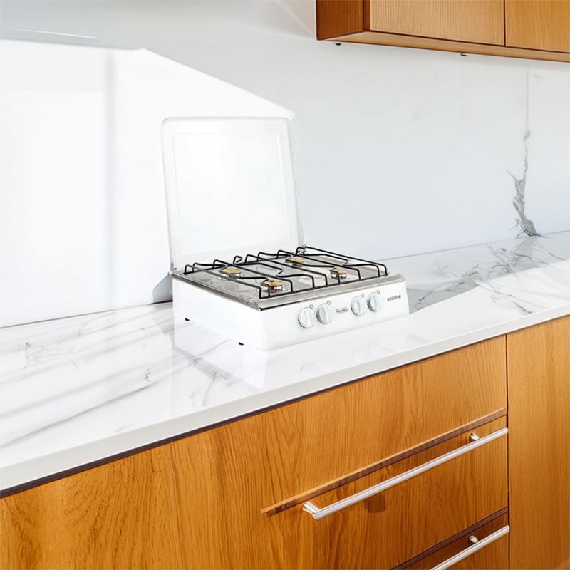Una cocineta de sobremesa que acompaña el ritmo de la cocina diaria. Con 4 quemadores y una tapa metálica, ofrece rapidez y protección con cada uso. Su formato compacto de 21 pulgadas facilita ubicarla en mesones sin ocupar todo el espacio, mientras la superficie esmaltada y el encendido manual entregan control directo sobre cada plato. La función manual de encendido ofrece respuesta directa sin depender de baterías, y la tapa protege durante la limpieza para un mantenimiento simple.