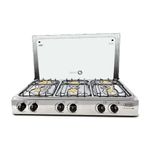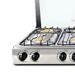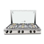 Entre las características diferenciales destacan 6 quemadores que permiten repartir tareas entre preparaciones grandes y pequeñas, un diseño empotrable que se integra sin sobresalir y una parrilla enlozada que facilita la limpieza. Terminados sin filos internos y externos reducen riesgos al manipularla, mientras 2 perillas negras resistentes al calor controlan cada zona con precisión. Las tapillas de bronce fundido y las bases de quemador de aluminio inyectado refuerzan durabilidad y rendimiento, acompañadas de regatones antideslizantes para mayor estabilidad durante la cocción.