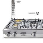 4 tapillas de bronce fundido y 4 bases de quemador en aluminio inyectado aseguran calor estable y distribución rápida. 4 perillas PVC doble cuerpo resisten al calor y permiten control directo con movimientos precisos. Tapa de vidrio templado y acabado en acero inoxidable mantienen una apariencia limpia y duradera, mientras la instalación empotrable se adapta a cocinas modernas para un look profesional y funcional.