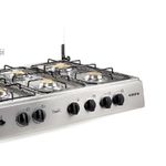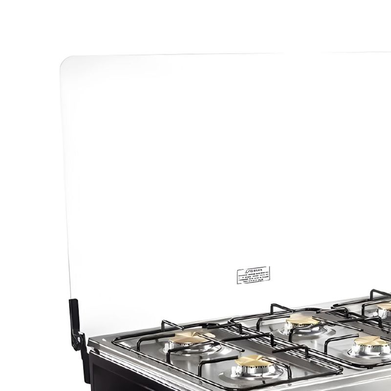 Además de la distribución de 6 quemadores con un tamaño Jumbo para sartenes grandes, destaca la parrilla de acero porcelanizado que resiste el uso diario y se limpia con facilidad. Las piezas de montaje en acero inoxidable y la tapa de vidrio templado serigrafiado ofrecen durabilidad y estilo. El encendido eléctrico facilita activar la cocción sin fósforos, y los regatones antideslizantes aseguran estabilidad durante la cocción.