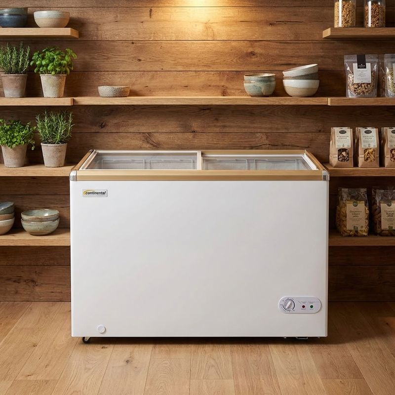 Conserva alimentos con eficiencia gracias a un congelador horizontal Continental SD-268Q de 268 litros, en acabado blanco con tapa de vidrio. Sus dimensiones de 78 cm de alto, 99 cm de ancho y 54 cm de profundidad permiten un uso eficiente del espacio, manteniendo un perfil cómodo para cocinas y áreas de almacenamiento.