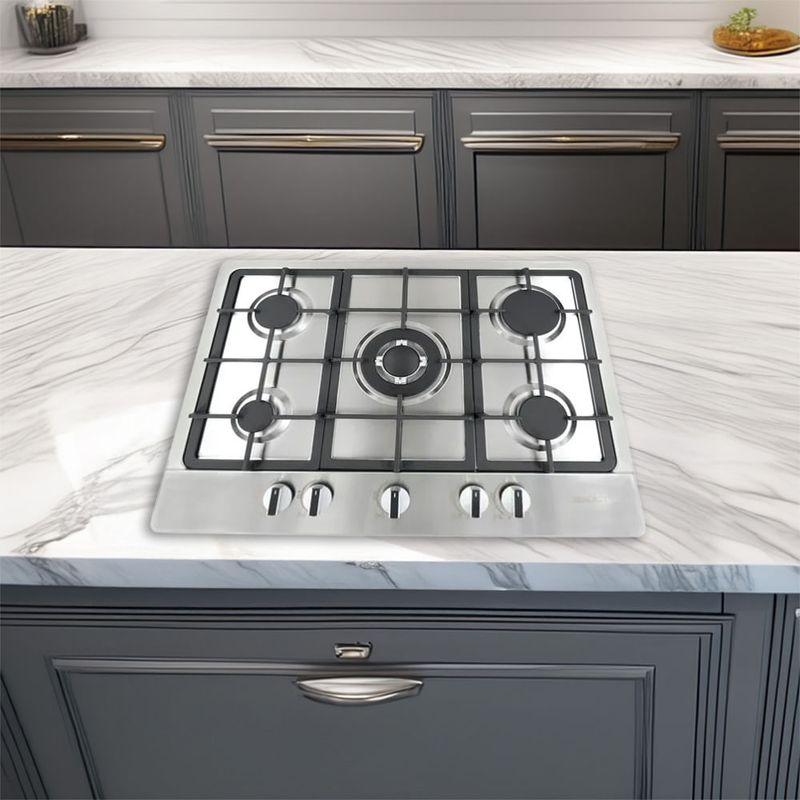 superficie de acero inoxidable, parrillas de fundición, 1quemador auxiliar 1.0kw + 2quemadores semirapidos 1.75kw + 1quemador rapido 2.5kw +1 triple corona 3.3kw *110-220v Garantía: 12 meses