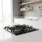 En cenas rápidas, esta encimera facilita preparar varios platillos al mismo tiempo sin complicaciones. Mientras se cocina, el encendido automático responde de inmediato y la distribución de los quemadores mantiene el ritmo de la receta. Tras el uso, la limpieza es sencilla gracias a la superficie de vidrio y a la parrilla de hierro fundido, que resisten el uso diario sin perder brillo.