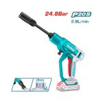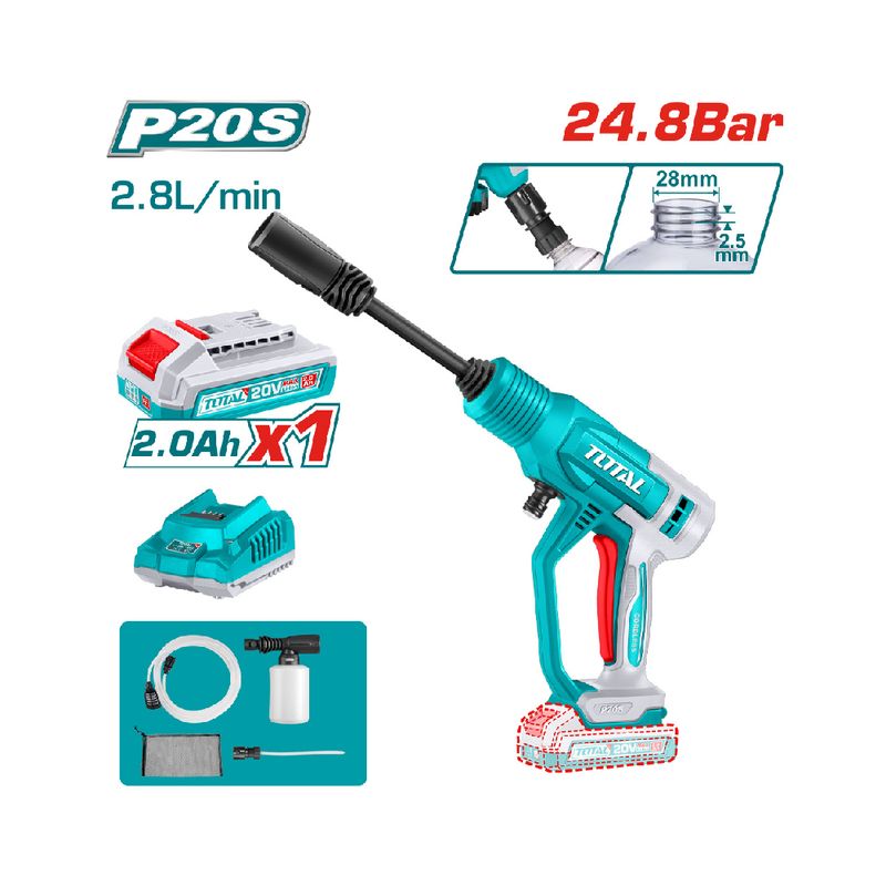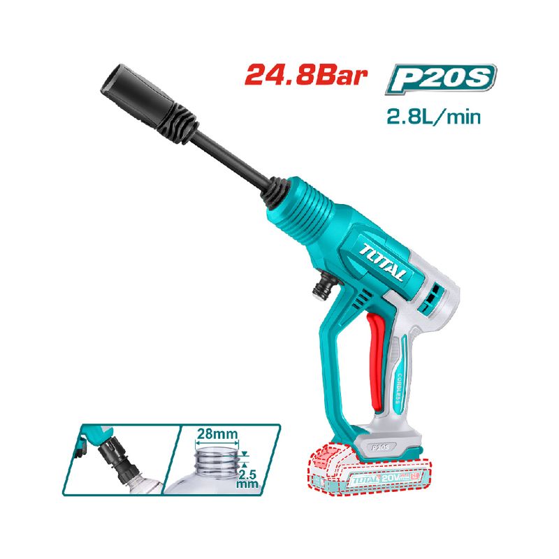 Hidrolavadora Inalámbrica Total Utpwli20362 en color turquesa propone limpieza sin cables para superficies exteriores y tareas domésticas de poca a media exigencia. Con presión de 24.8 Bar y caudal de 2.8 L/min, combina rendimiento y manejabilidad en un equipo compacto. Gracias a su formato sin cable, evita enredos y facilita el lavado de muros, vehículos y mobiliario alejados de la toma eléctrica.