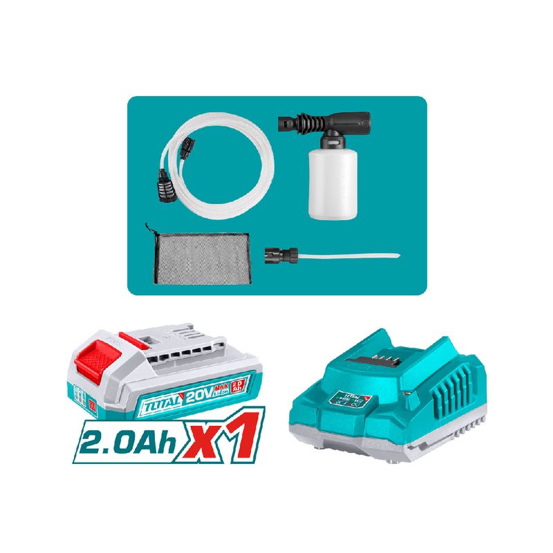 Entre sus accesorios destacan la pistola de rociado con dos patrones, la manguera de entrada de agua de 6 metros con conector rápido, un productor de espuma de 300 ml, el conector de auto succión y una bolsa portátil para transporte. El sistema de auto parada optimiza el uso de agua y de batería, manteniendo el control durante cada ciclo de lavado.