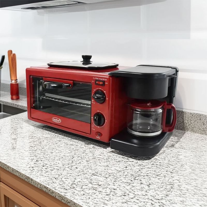 Desayunos y meriendas rápidas con un único equipo 3 en 1 que tosta, hornea y prepara café. Capacidad de 9 litros y 1090 watts para preparar más en menos tiempo, con un acabado Rojo con Negro que aporta estilo a la encimera. Su rango de temperatura de 100 a 230 °C abre caminos para tostadas crujientes, panes dorados y cafés calientes, todo en un solo aparato compacto y práctico.