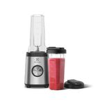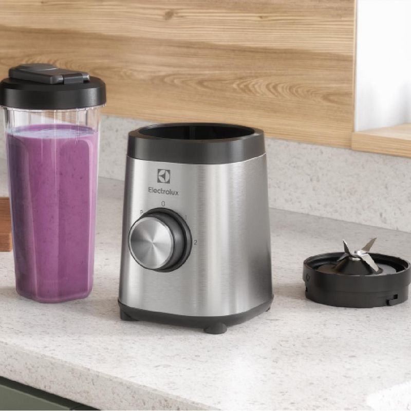 La licuadora portátil Electrolux Pulse Efficient, modelo P8749, en color Silver, ofrece 350 W y dos velocidades para batidos y jugos rápidos. El vaso principal es de plástico y tiene capacidad de 0,6 L. Incluye dos botellas de 600 ml para llevar con cerradura de seguridad.