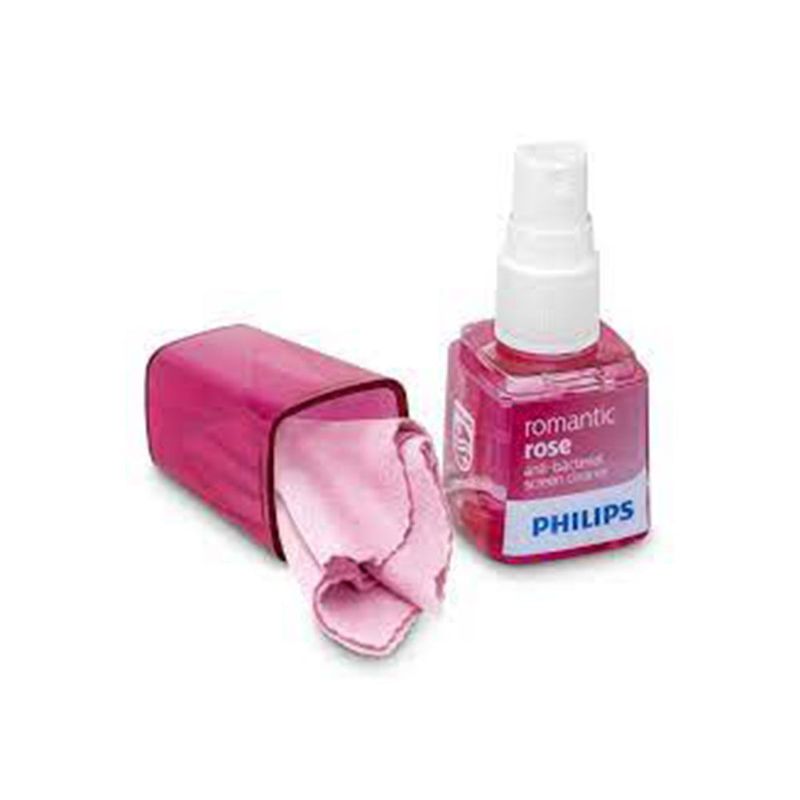 El Limpiador Antibacterial de Pantalla Philips combina un liquido de limpieza antibacterial con un paño de microfibra reutilizable. Su aroma Romantic Rose y su tono rosa realzan la experiencia de limpieza, mientras la fórmula aporta antirrayas y una acción antiestática que repele el polvo.