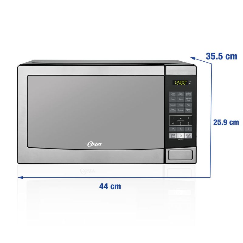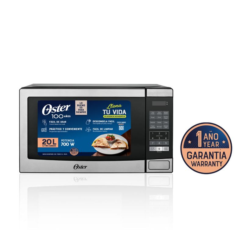 PUERTA TIPO ESPEJO, FRENTE DE ACERO INOXIDABLE, RELOJ DIGITAL, PLATO GIRATORIO DE VIDRIO TEMPLADO, APERTURA DE PUERTA CON BOTON, SEGURO DE NIÑOS, PROGRAMAS DE COCCION PREDETERMINADOS Garantía: 12 meses