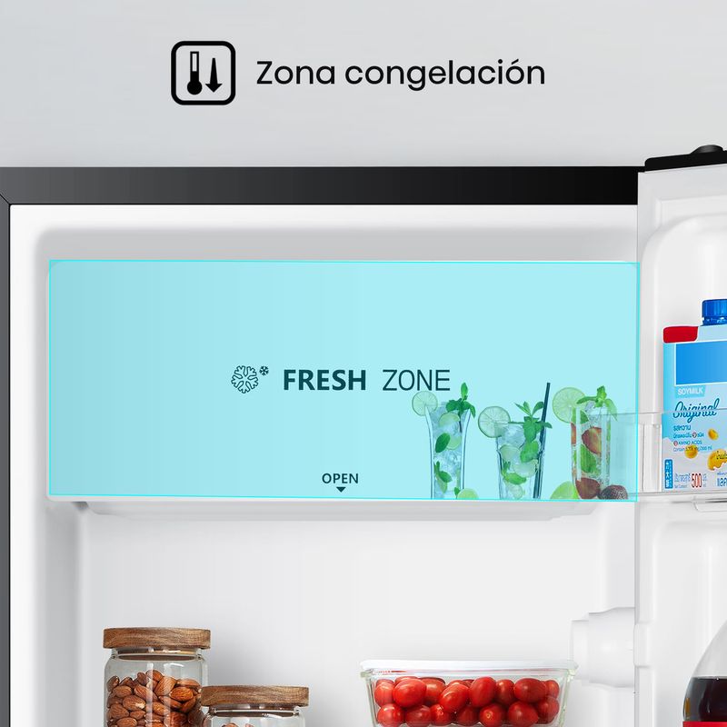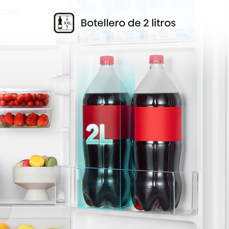 En el interior hay un espacio para una botella de 2 litros y un soporte que facilita la organización con comodidad. La estructura permite un uso práctico y, además, incluye una base estable para evitar movimientos. La puerta reversible facilita la apertura según la distribución de la habitación.