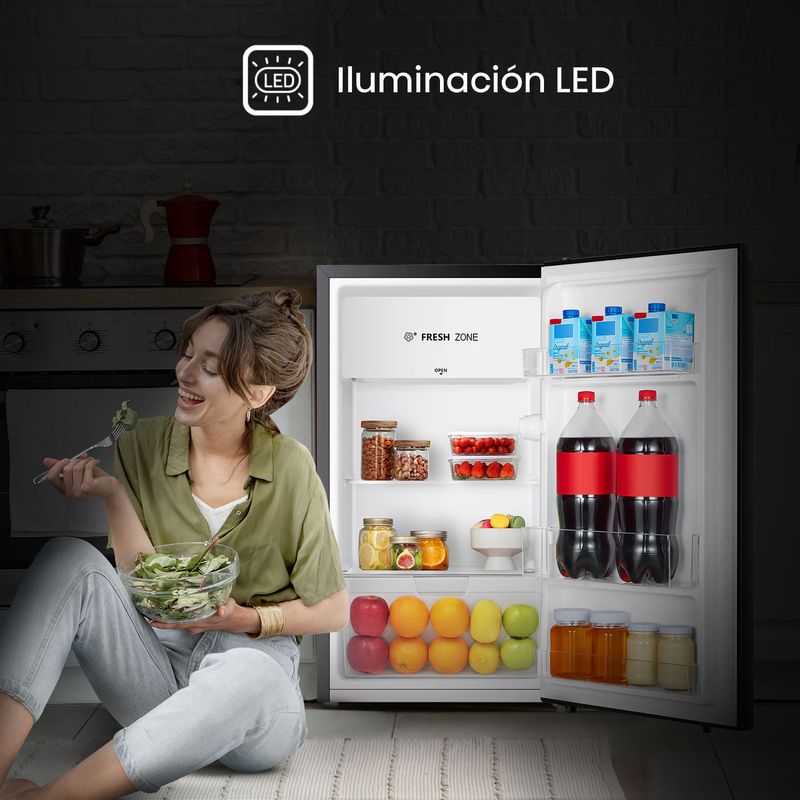 La iluminación interior permite ver el contenido sin encender más luces. El control mecánico con termostato ajustable permite adaptar la temperatura con facilidad. Gracias a la puerta reversible, la colocación en la cocina o habitación se adapta sin complicaciones.