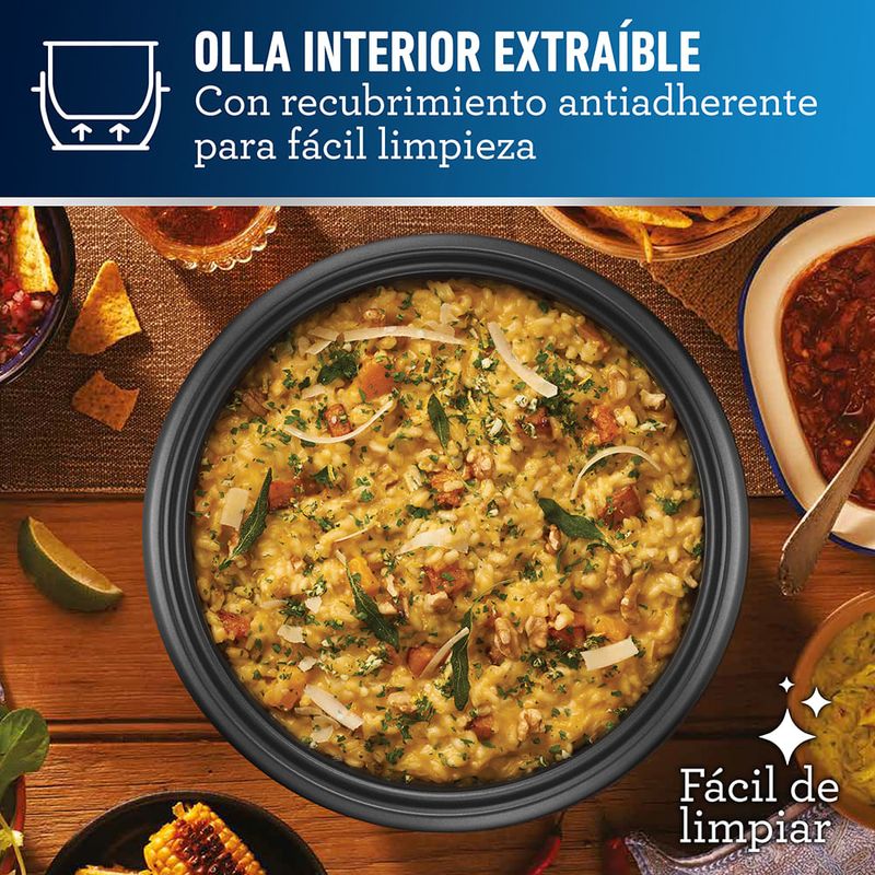 El interior de la olla es de acero inoxidable y es extraíble, con recubrimiento antiadherente para facilitar la limpieza. La tapa de vidrio refractario cuenta con ventilación para evitar la cocción excesiva y el botón de un solo toque simplifica el manejo. Incluye taza medidora y cucharón para servir, y ofrece capacidad para 12 tazas.