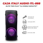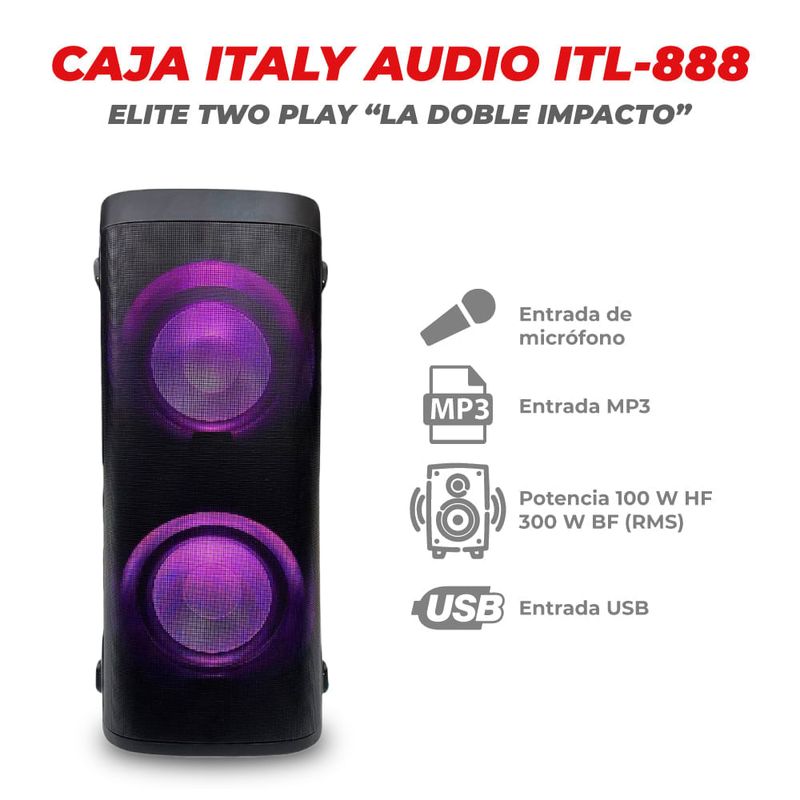 Parlante activo Italy Audio ITL-888 P8765 ofrece 100 W RMS y luces RGB rítmicas que marcan el ritmo. Su color negro aporta un toque moderno y versátil para presentaciones, fiestas o reuniones. Integra un amplificador para una experiencia de audio lista para usar desde el primer momento. La potencia de 100 W permite llenar el ambiente sin perder detalle en las frecuencias medias y altas. Las luces RGB rítmicas se sincronizan con la música, aportando un dinamismo visual que complementa la interpretación musical. Esta combinación de sonido y iluminación crea un punto focal visual que acompaña la música y facilita la dinámica en el escenario. En eventos con distintos géneros musicales, este parlante mantiene el volumen adecuado sin perder claridad de las voces.