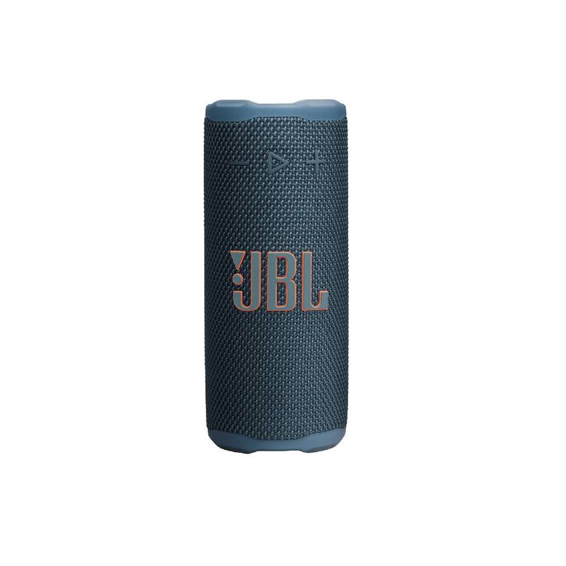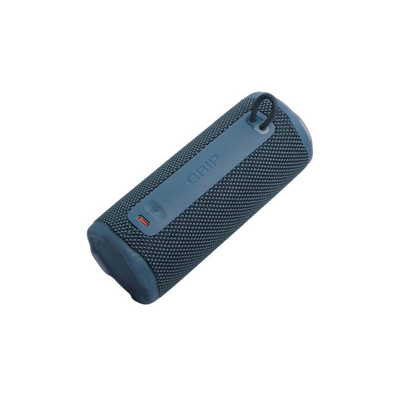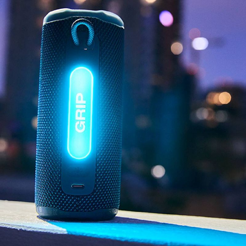 Parlante JBL Grip Azul ofrece un sonido potente en un formato que se puede sostener con una mano. Con 16 W RMS y Bluetooth para reproducir sin cables, trae una batería integrada capaz de sostener la música hasta 14 horas. Su certificación IP68 protege frente al agua y al polvo, y la construcción utiliza plástico y tejido reciclados, con embalaje FSC.
