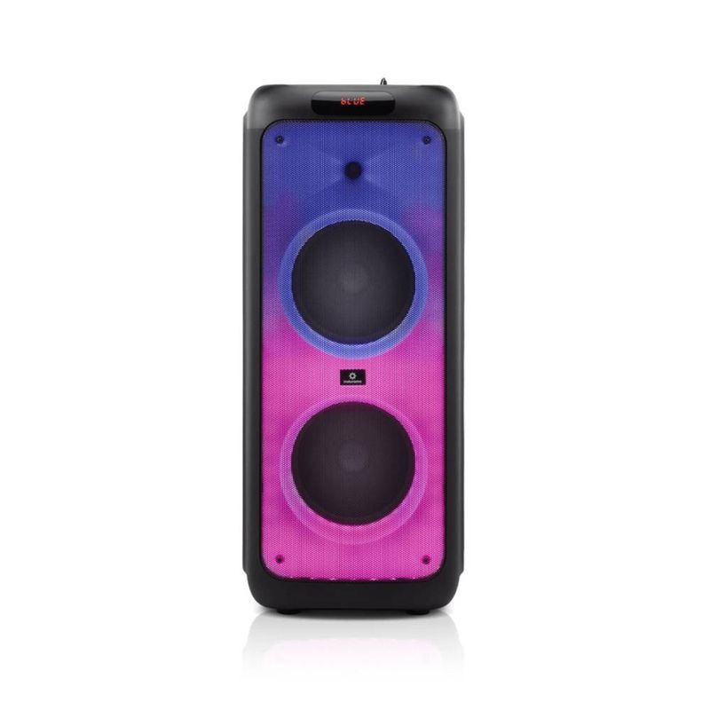 El parlante portátil Indurama CMI-70 combina dos conos de 10 pulgadas y una potencia que llena el ambiente. Con 75 000 W PMPO y 30 W RMS más 10 W en el tweeter, ofrece sonido claro y contundente; las luces LED RGB dinámicas añaden ambiente y la batería interna de 4500 mAh admite una carga entre 8 y 10 horas y una reproducción de 6 a 8 horas según el volumen.