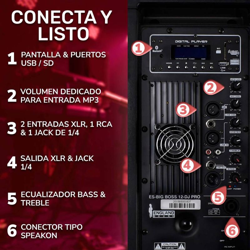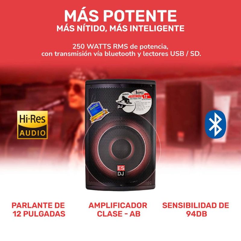 Parlante activo de 12 pulgadas con 250W RMS ofrece sonido claro y contundente para eventos medianos, con un woofer potente y un tweeter de 34 mm para mayor claridad. La pantalla LED facilita el monitoreo en vivo y el ecualizador de graves y agudos permite ajustar el tono según la sala. Con Bluetooth y reproducción USB/SD, la música fluye sin cables, y el control remoto añade comodidad en el escenario.