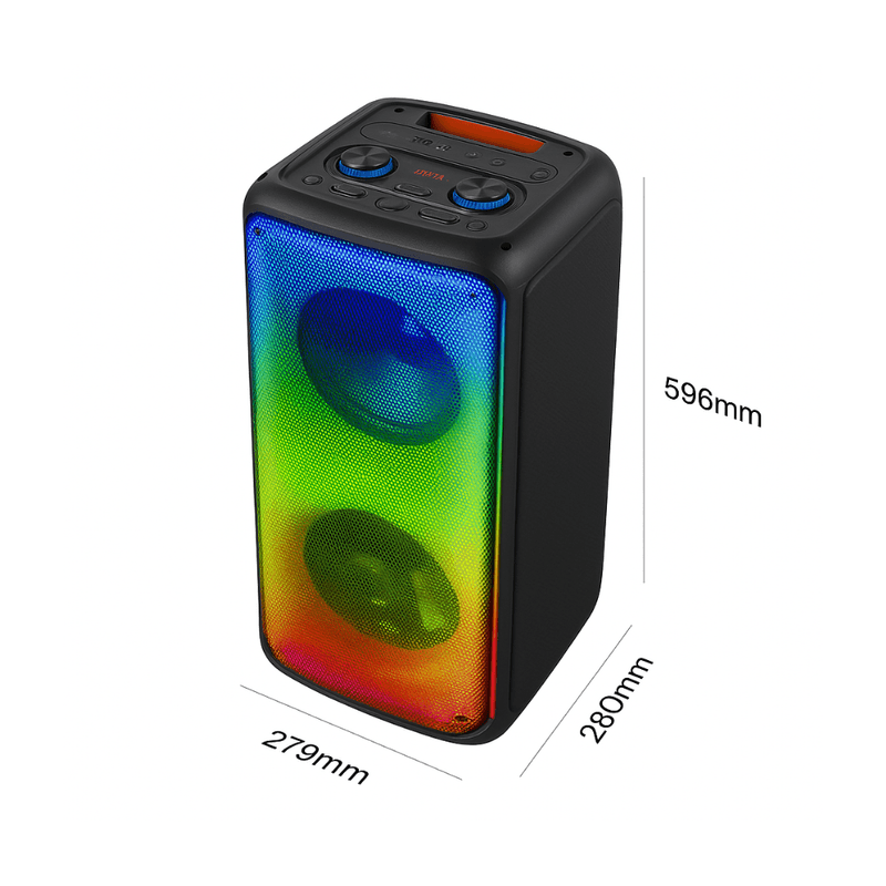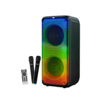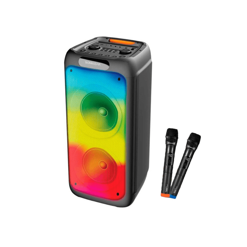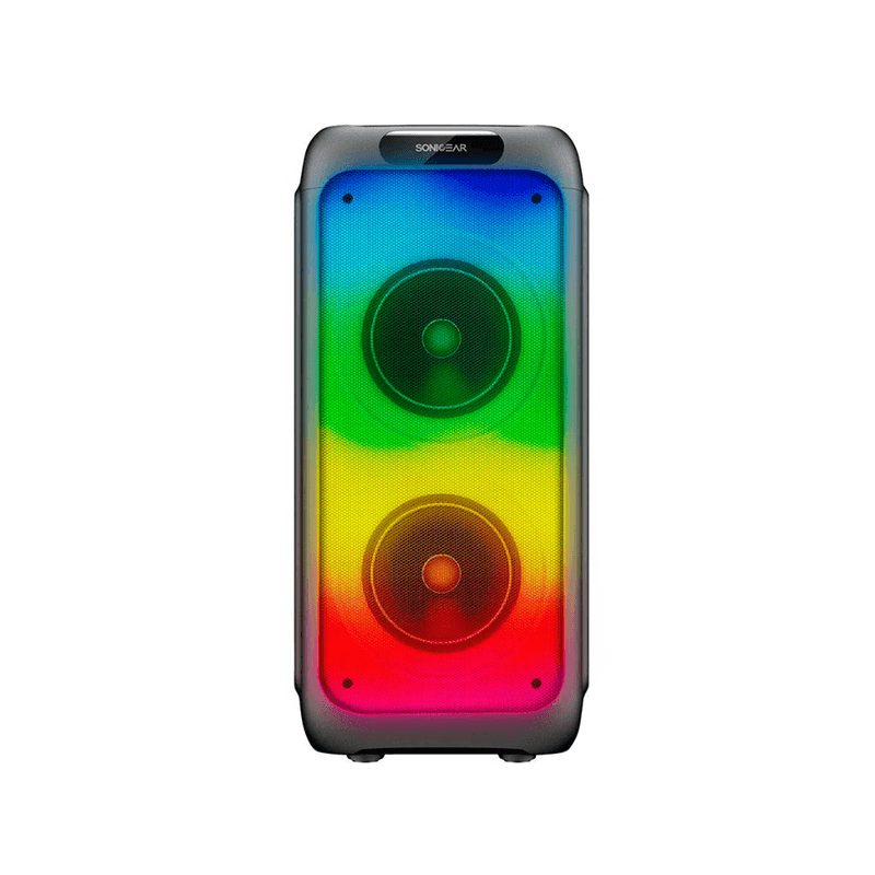 Parlante SonicGear AudioX Pro 800 HD. Potencia total hasta ~ 150 W PICO. Drivers: 2 altavoces de 8″ (2 × 8″). Respuesta de frecuencia: 100 Hz – 20 kHz. Distorsión: ≤ 1.0 %. Bluetooth 5.3 alcance ~ 10 m. USB y tarjeta TF / microSD hasta 32 GB. Entrada auxiliar. FM radio integrada. Modo Karaoke incluye 2 micrófonos inalámbricos. Función TWS True Wireless Stereo permite emparejar dos unidades para sonido estéreo más amplio. RGB efectos de iluminación LED multicolor. Batería interna recargable 3000 mAh / 7.4 V. Autonomía aproximada 3.3 a 4 horas. Luces RGB sincronizadas con la música. Micrófonos incluidos: 2 micrófonos inalámbricos Control remoto incluido.