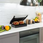 Entre sus ventajas está el control de temperatura con indicador y un apagado automático que aporta seguridad. La bisagra flotante y la bandeja de goteo facilitan la cocción y la limpieza, mientras la bandeja recogemigas mantiene el área ordenada.
