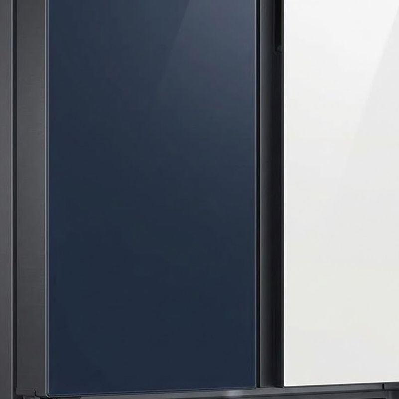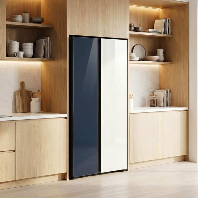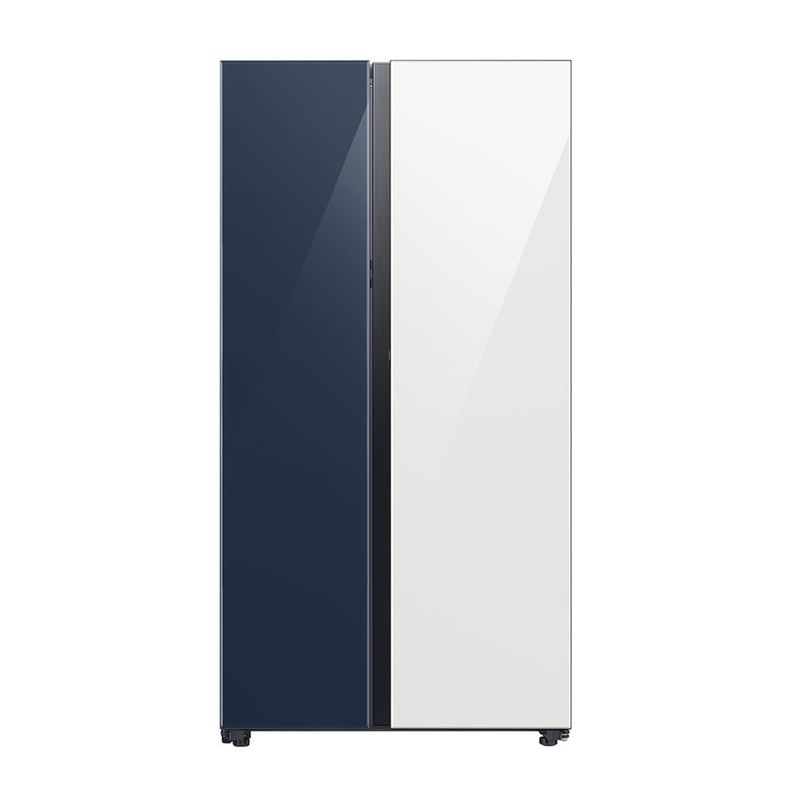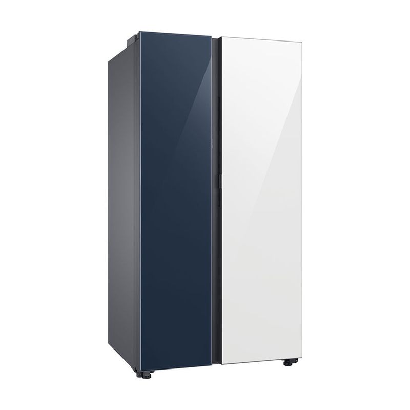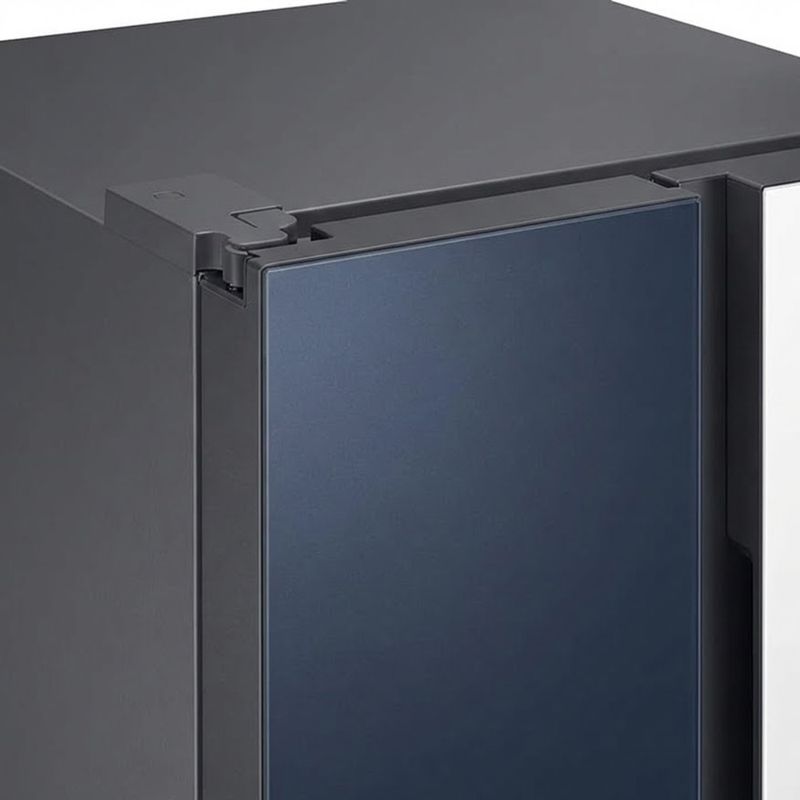El acabado combina blanco y azul en un conjunto elegante. Puertas planas con tiradores empotrados aportan líneas limpias, mientras el panel de control digital y el panel táctil permiten manejar la temperatura con precisión. Dispensador de agua e hielo integrado facilita el acceso diario y la iluminación interior mantiene los alimentos visibles sin esfuerzo.