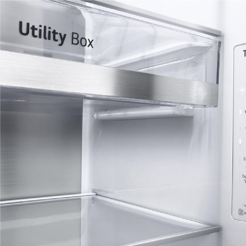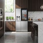 El sistema de control se complementa con InstaView ThinQ, que se activa con dos toques para revisar ajustes y programar temperaturas desde el móvil. El acabado plateado aporta un toque moderno y versátil a la cocina, y la distribución interna ofrece compartimentos, anaqueles y bandejas ajustables para adaptar el espacio a cada artículo.