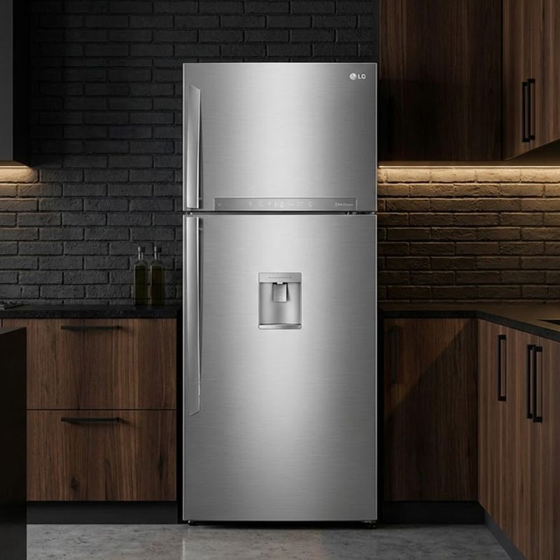 La refrigeradora LG VT48SPYC es un modelo top mount con congelador arriba que ofrece 491 litros de capacidad total, con sistema No Frost y tecnología Smart Inverter. Dispone de panel táctil con luz, dispenser de agua y un acabado plateado que combina con cocinas modernas.