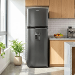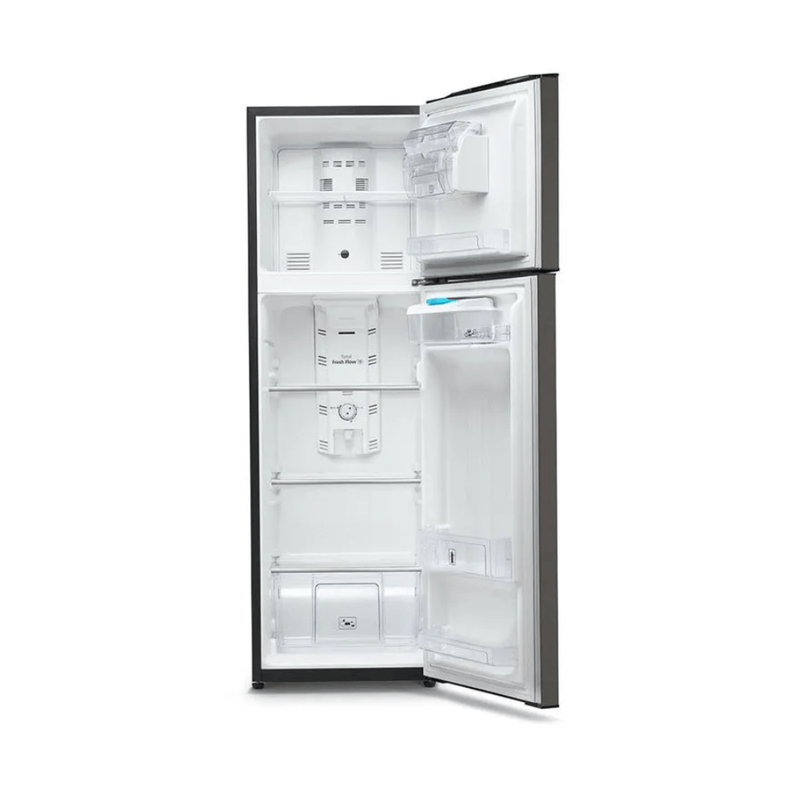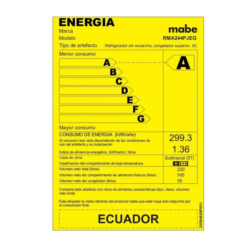 La refrigeradora No Frost Mabe RMA244PJEG ofrece 244 litros brutos en un diseño grafito sobrio. Su sistema No Frost evita la formación de escarcha y la tecnología Home Energy Saver, junto con el modo MultiAhorro Energético, reduce el consumo sin sacrificar frescura. El sistema Total Fresh Flow mejora la distribución del frío y mantiene los alimentos en condiciones óptimas. Pantalla LCD y panel de control analógico combinan claridad y sencillez en cada ajuste. Medidas: 157,5 cm de alto, 55,6 cm de ancho y 67 cm de profundidad.
