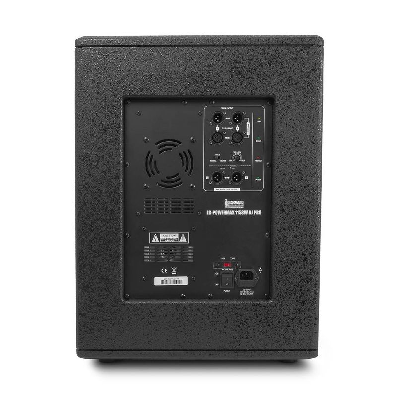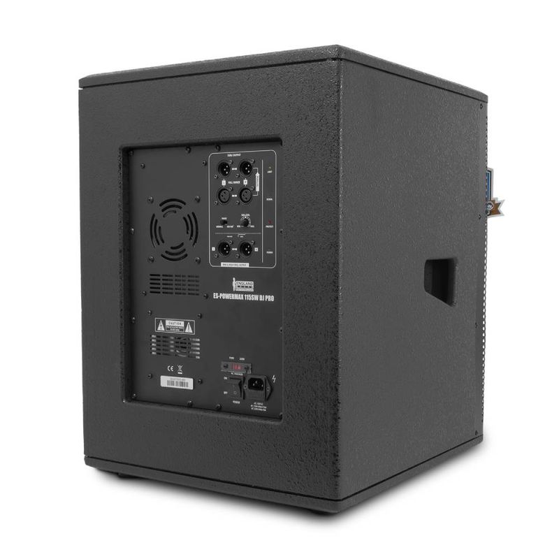 Contenido del empaque: subwoofer ES-POWERMAX 115SW DJ PRO, cable de alimentación y manual de usuario. Consejos de uso: colocar el subwoofer en el centro del recinto y considerar usar en pares para eventos grandes. Mantenimiento: limpiar las rejillas del ventilador periódicamente. Garantía de 12 meses.