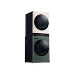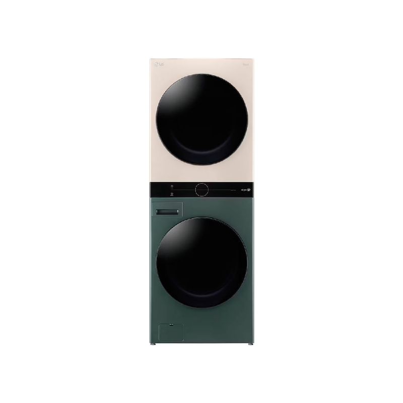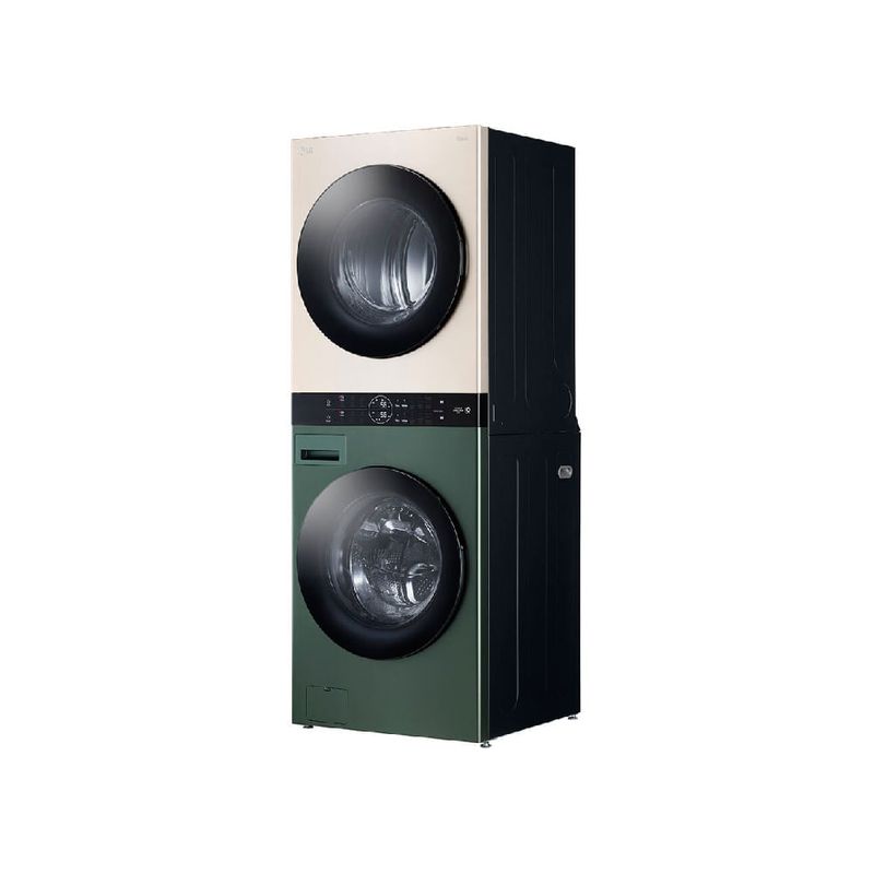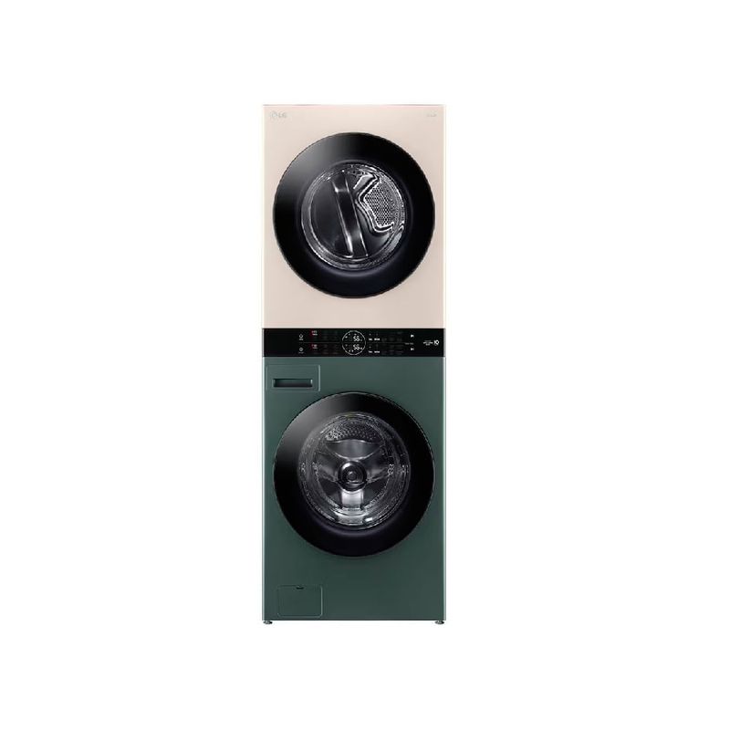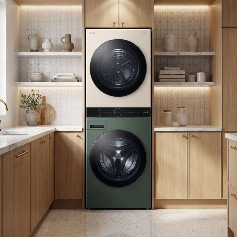 Para completar, este equipo resulta práctico en días ocupados: inicia cargas grandes, aprovecha ciclos automáticos que optimizan consumo y tiempo, y controla todo desde el panel digital sin complicaciones. En espacios amplios la instalación vertical libera espacio útil, mientras el acabado en verde y beige aporta un toque contemporáneo a la lavandería.