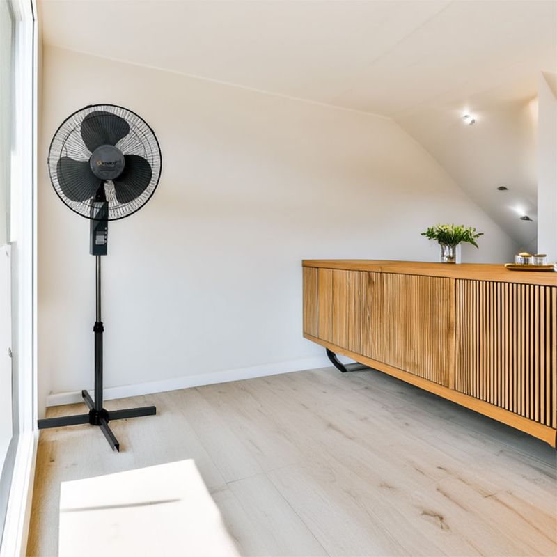 El ventilador de pedestal Imaco FS1631 P8777 combina estilo negro con versatilidad, y ofrece un tamaño compacto de 20.7 pulgadas para caber en distintas estancias. Su diseño 3 en 1 permite transformarlo de pedestal a mesa o a instalación en la pared, adaptándose a la disposición del espacio.