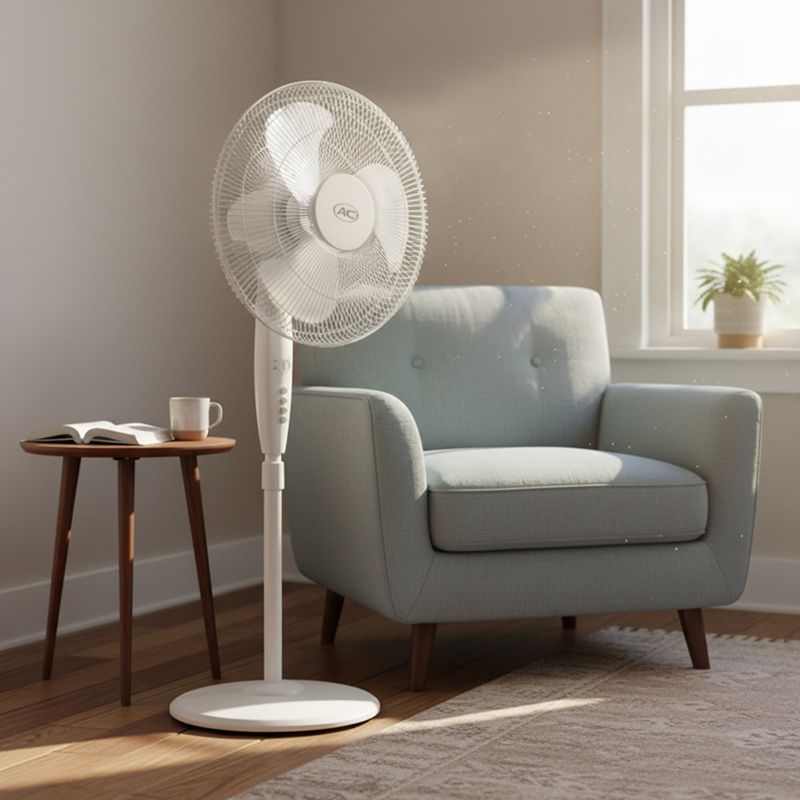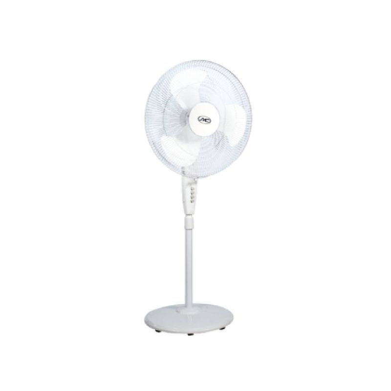 Ventilador de pedestal SMC de 18 pulgadas, modelo SMCVN18PN2, con tres velocidades y control mecánico. Opera a 60 W y 110 V, acabado blanco y diseño compacto. Peso ligero, perfil estable y movilidad para situarlo en salas, dormitorios o espacios de trabajo. Dimensiones aproximadas: altura 61 cm, ancho 37 cm y profundidad 26 cm. Garantía de 12 meses.