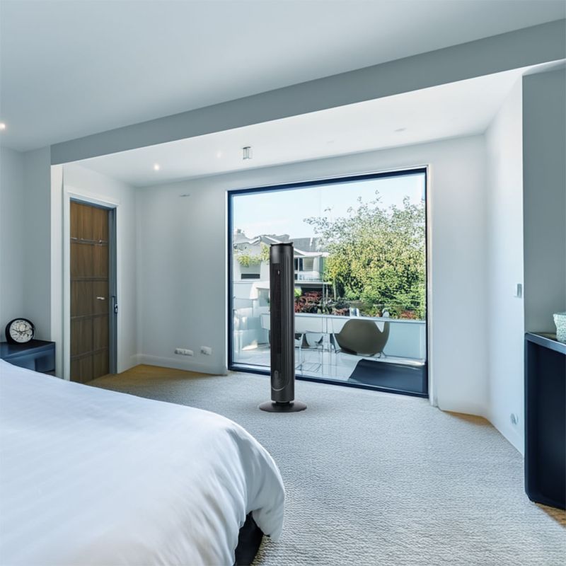 Su diseño 2 en 1 combina ventilador de torre y aromaterapia, con compartimiento para aceite esencial. Permite brisas suaves en modos Normal, Sleep y Brisa Natural. La oscilación de 90° cubre toda la habitación.