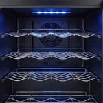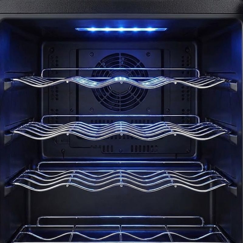 Iluminación LED interior para localizar rápidamente la botella deseada y un panel táctil de control de temperatura que facilita ajustes precisos. Los estantes de alambre cromado son extraíbles, ofreciendo flexibilidad para acomodar formatos variados y ampliar el espacio disponible cuando la ocasión lo requiera. La temperatura se mantiene estable gracias al sistema termoeléctrico, apta para conservar el bouquet y la integridad de tintos y blancos. Patas estabilizadoras aseguran una base firme sobre superficies planas.