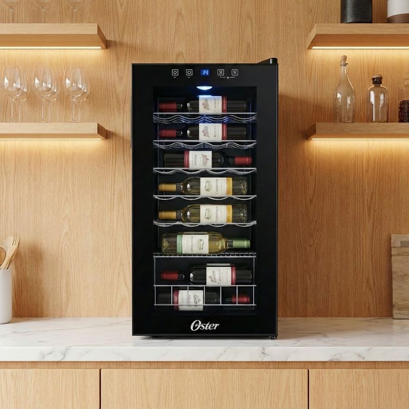 La vinera Oster OS-WC28B es una opción elegante para conservar vinos en casa. Con capacidad para 28 botellas y 88 litros, ofrece un funcionamiento silencioso y una puerta panorámica de vidrio templado que facilita la visualización de la colección sin abrirla. La iluminación interior LED resalta cada etiqueta, mientras el acabado en negro aporta un toque contemporáneo que complementa la cocina, el comedor o el área de bar gracias a su diseño compacto y limpio.