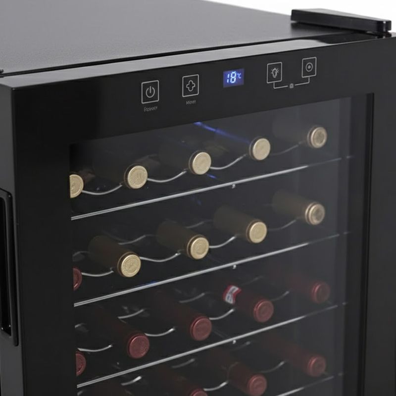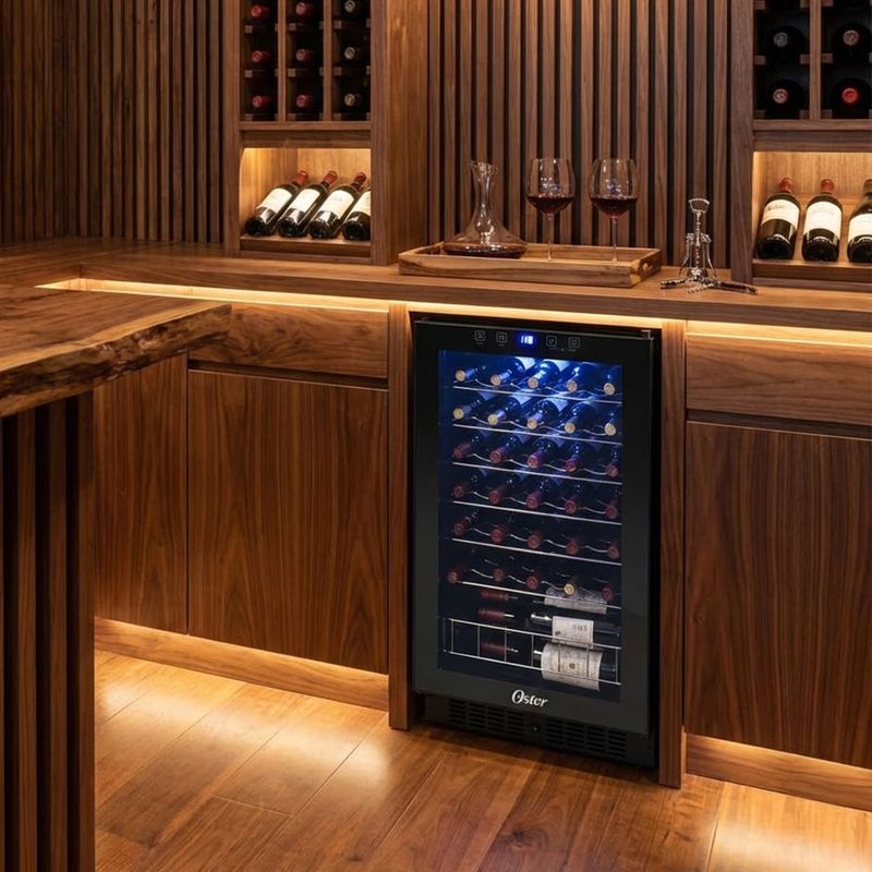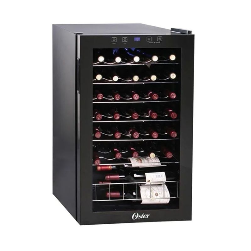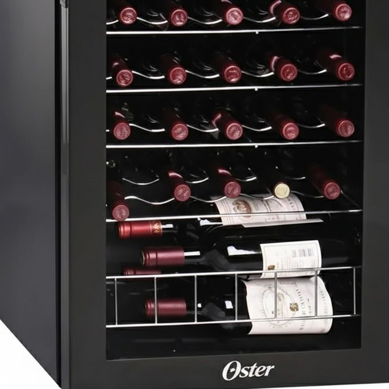 La Vinera Oster OS-WC35B ofrece una solución elegante para conservar vinos en casa: capacidad para 35 botellas y 95 litros, en un acabado negro que combina con cualquier cocina. Su puerta de vidrio templado, con vista panorámica, facilita ver las botellas sin abrir la puerta.