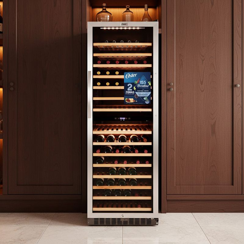 La Vinera Oster OS-WCC155SSD ofrece capacidad para 155 botellas y 428 litros, pensada para conservar una colección en dos zonas de temperatura. Las zonas regulables permiten mantener vinos blancos y tintos a sus rangos ideales sin mezclar aromas. El panel de control digital LED facilita ajustar cada zona con precisión, mientras la luz interior LED azul o ámbar facilita la visualización de etiquetas incluso con la puerta cerrada. El acabado en inox refuerza la elegancia y la durabilidad en cocinas o bares domésticos, y la iluminación se puede adaptar para diferentes escenarios de servicio.
