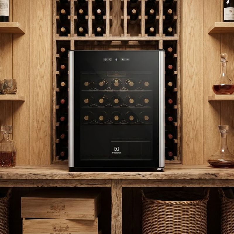Vinera vertical Electrolux ERWV24W6MWB para almacenar 24 botellas en una única puerta. Su acabado en color negro aporta sobriedad y estilo al conjunto de la cocina. La puerta de doble cristal y un compresor trabajan juntos para mantener la temperatura estable en un rango de 5°C a 18°C, algo clave para conservar el sabor, la textura y las propiedades de ambiente del vino. Con una configuración de una zona, la temperatura se mantiene de forma constante sin fluctuaciones que afecten la crianza y la experiencia sensorial.
