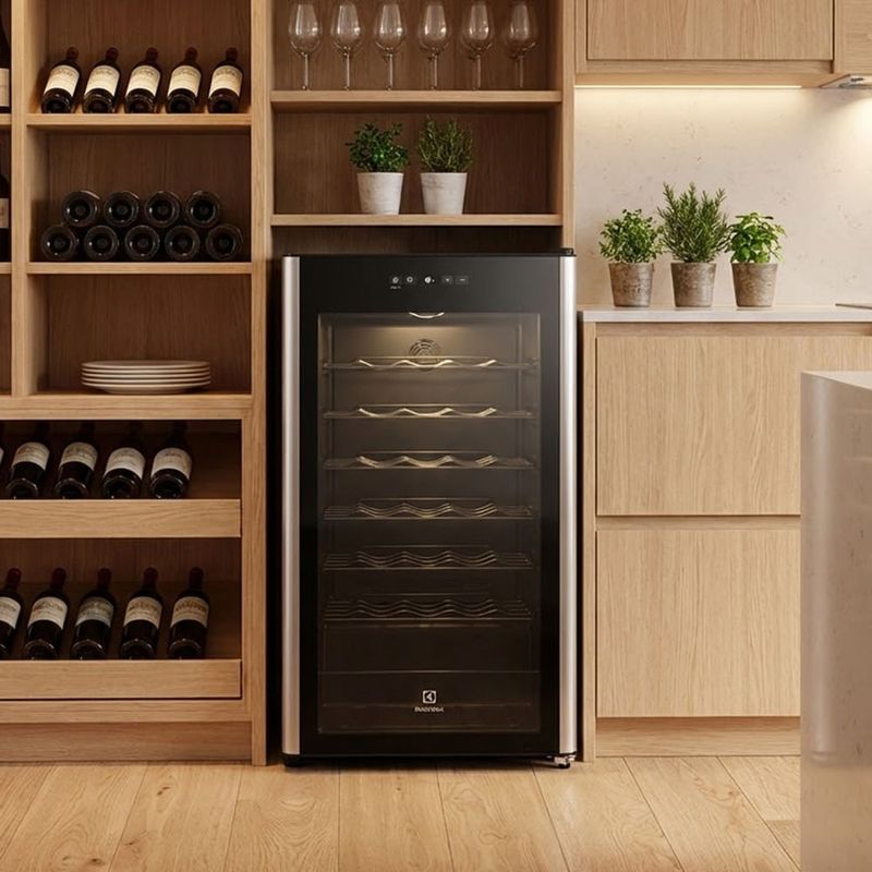 La Vinera Vertical Electrolux ERWV34W6MWB es una cava pensada para conservar una colección de 34 botellas en una sola zona de temperatura, entre 5°C y 18°C. Su puerta de doble cristal protege el vino de cambios de temperatura y de la luz exterior, mientras el compresor mantiene la temperatura estable. El panel digital LED facilita controles y lectura de valores sin complicaciones, y cada ajuste se realiza con precisión para respetar las particularidades de cada vino.