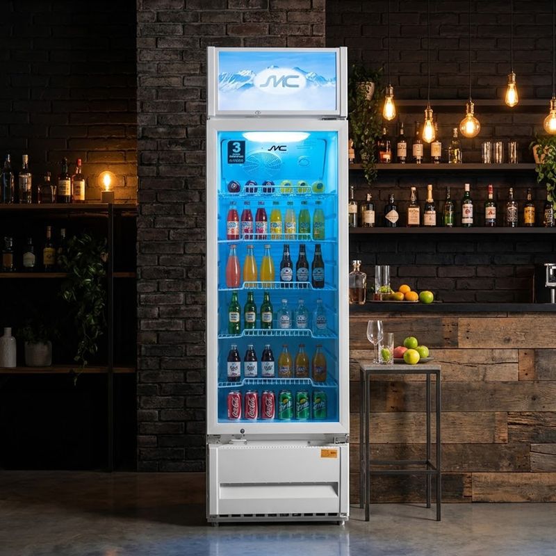 En su interior, una repisa de vidrio permite organizar frutas, verduras y productos exhibidos; un compartimiento para congelar añade versatilidad. La iluminación interior realza la visibilidad de los productos, mientras que la refrigeración por compresor garantiza una temperatura estable y fiable.